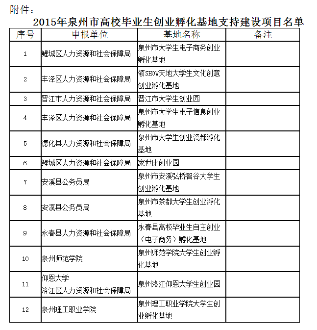 根据《泉州市人民政府关于做好2015年普通高等学校毕业生就业创业工作的通知》(泉政文〔2015〕79号)和《泉州市力资源和社会保障局关于做好2015年泉州市高校毕业生创业孵化基地支持建设项目申报工作的通知》(泉人社...