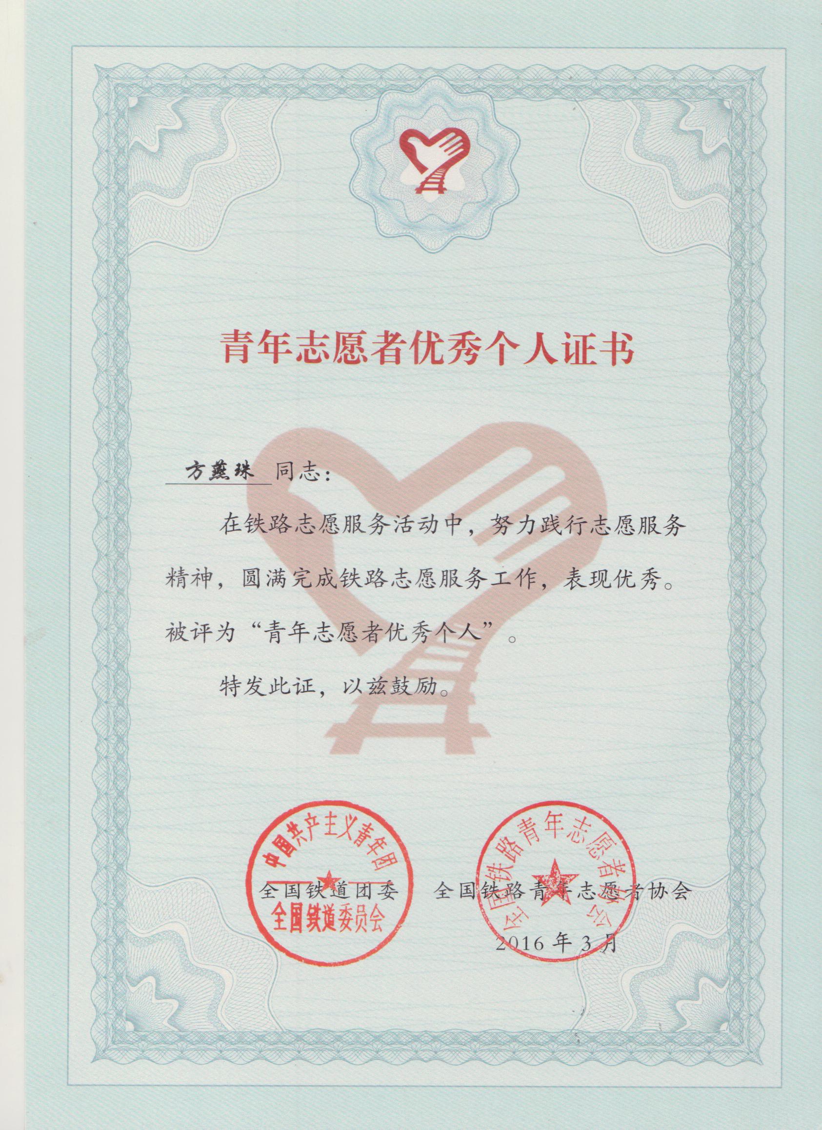 我校学子荣获全国铁道团委表彰的“青年志愿者优秀个人”