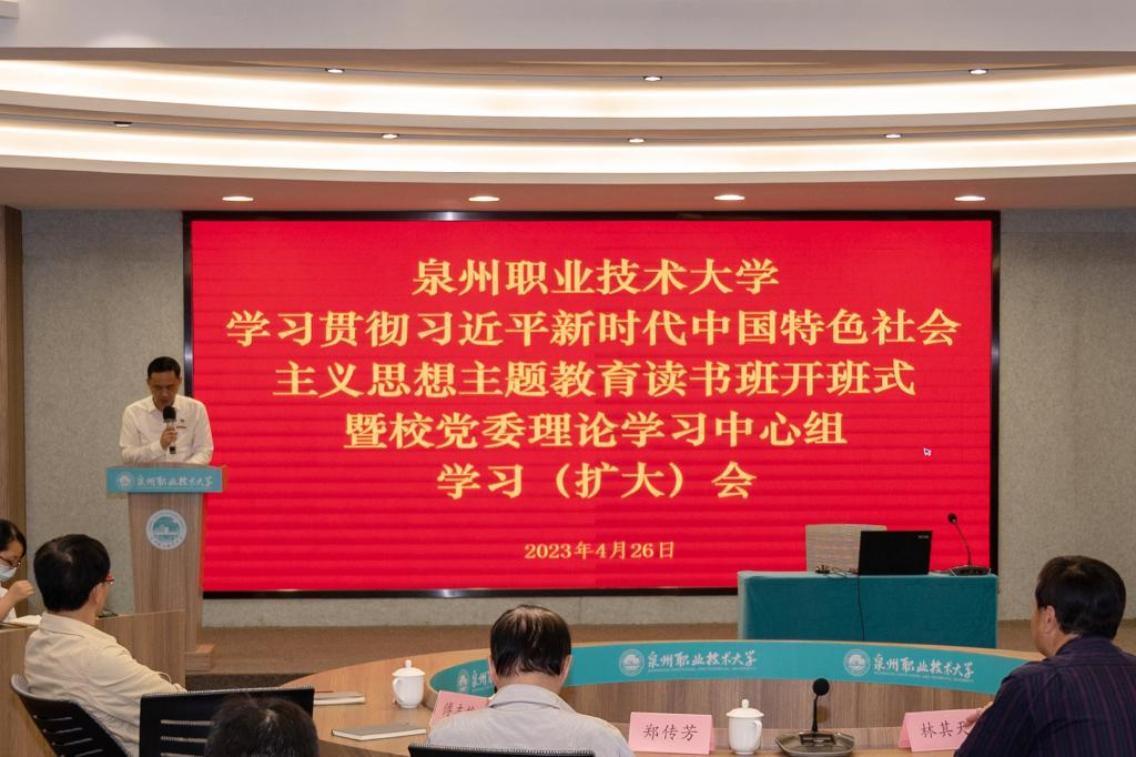 4月26日下午,泉州职业技术大学举行学习贯彻习近平新时代中国特色社会主义思想主题教育读书班开班式暨党委理论学习中心组学习(扩大)会。省委教育工委、省教育厅学习贯彻习近平新时代中国特色社会主义思想主题教育协调推进五组组长林其天莅会指导,中央马克思主义理论研究和建设工程首席专家郑传芳教授应邀莅校作《学习<习近平著作选读>第一、二卷》专题辅导报告,校党委书记傅志雄主持会议。傅志雄作读书班动员讲话。他指出,...