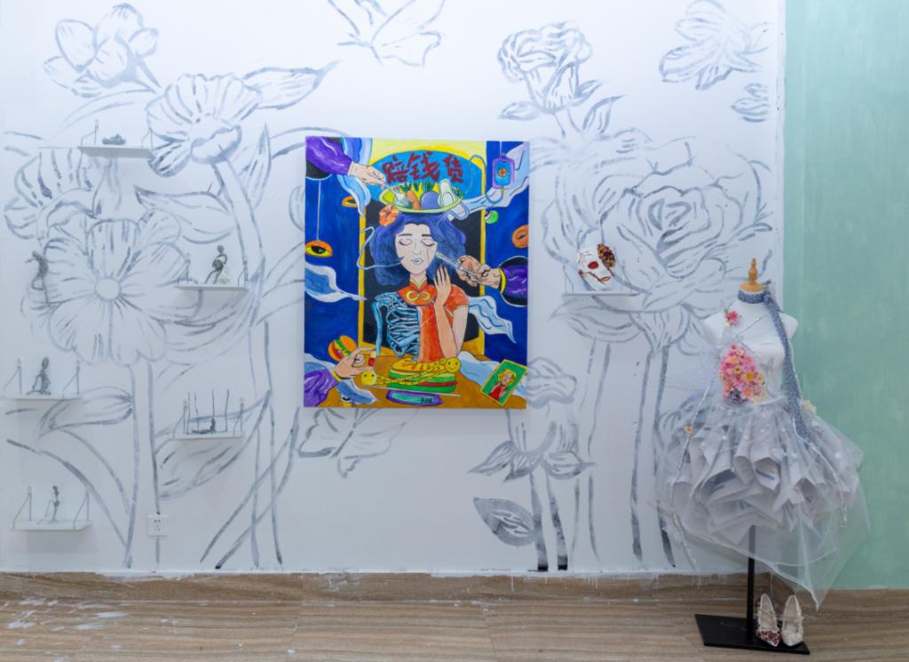 比赛限定每支参赛团队200元的创想基金,选手们化身“创意理财师”,在废旧织物、再生木料、自然枯枝、工业边角料等材料中挖掘无限可能。有的用蛋糕盘制作蛇年主题装置,有的将废旧报纸拼贴成女性裙摆……