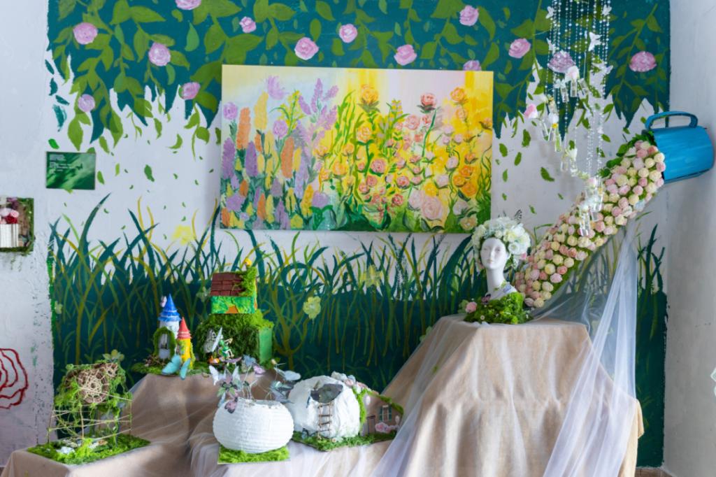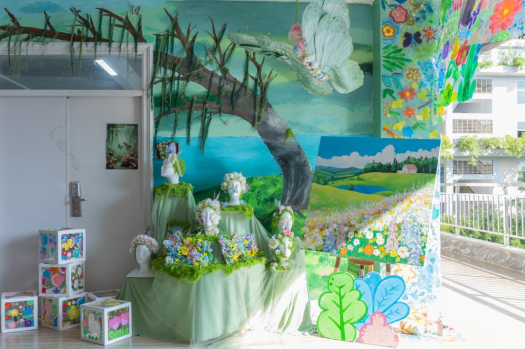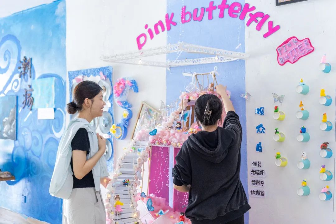 比赛期间,教育学院4楼实训室的备赛间,处处是选手们忙碌的身影,为达到理想中的效果,同学们不断打磨、试验。团队成员各司其职,用团结协作和精益求精的精神,将创意凝聚成独一无二的环创作品。《巨人的花园》团队从绘本故事解构出发,历经数十次设计修改;《万物新生》团队为了呈现“破茧成蝶”的视觉张力,反复试验了3种材质的蝴蝶翅膀透光效果;《春之颂歌-自然的礼赞》团队为了还原田野肌理,手工雕刻200余片纸质麦穗。