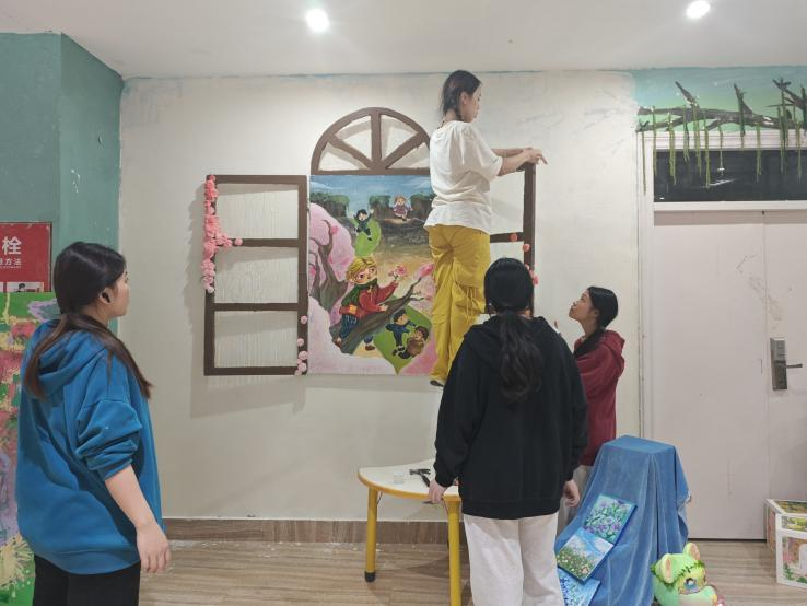 教育学院学前教育专业的同学作为参赛选手,以《3-6岁儿童学习与发展指南》为指引,将蒙台梭利“有准备的环境”、瑞吉欧“第三位老师”等国际前沿教育理念融入创作,让墙面变身会“说话”的教育场域,为大家呈现了一场“环境即课程”的沉浸式体验。