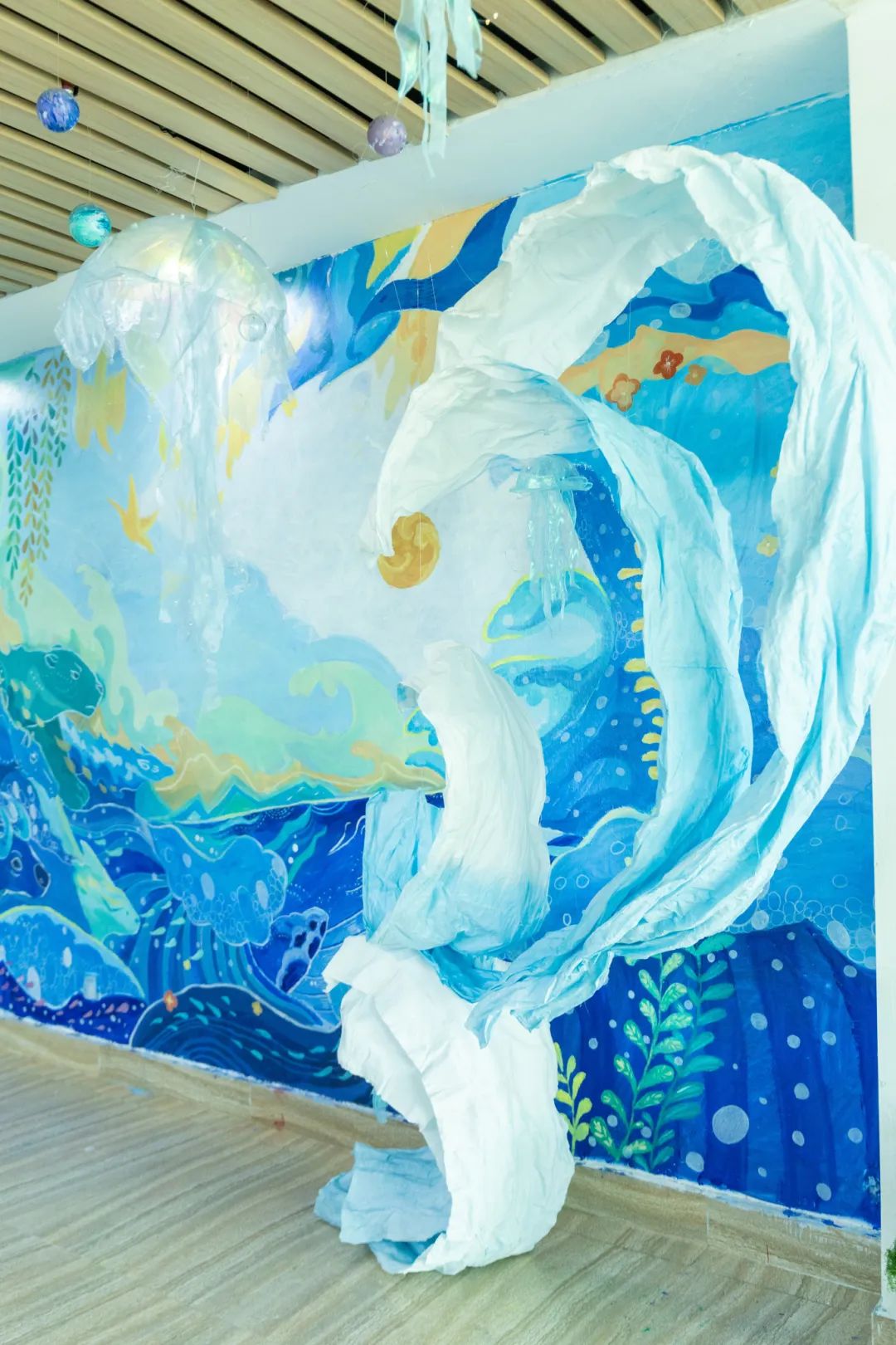 这场持续10天的展览吸引了千余名幼儿园教师、家长和师生参观。一位带着孩子观展的家长感慨:“原来墙面不只是装饰,还能讲故事、教知识。”而参展学生更在实践中完成了职业认知的蜕变,《生命之源泉》团队成员陈晓慧说:“当我们用废旧纸张制作海洋波纹时,突然明白‘环境创设’不是简单的美化,而是要让每个元素都蕴含教育意图。”