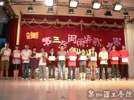 在富有浓郁地域特色的旋律中,我们情不自禁的置身于闽南文化。在璀璨的灯光下,台上的选手们都各自展现才华和美妙的歌声,焕发其独特魅力。现场气氛异常热烈,观众们鼓掌声,喊叫声更是连连不断。最后,09旅游班黄嘉威同学荣获本次比赛冠军。