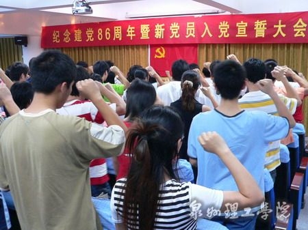 在纪念中国共产党建党八十六周年之际,我院于6月9日下午5:30在思恩楼三A会议厅隆重举行了2007年新党员入党宣誓大会。85名师生在大会上进行了入党宣誓。院党委书记吴金营、院长苏志明、院党委副书记毛伟雄、吴滨如等领导同志,学院党委委员、全体党员、入党积极分子参加了大会。