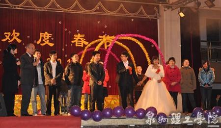 晚会现场布置得格外温馨,由陈丹表演的歌伴舞《欢乐中国年》拉开了本场晚会的序幕。车辆系选送的舞蹈《新第八套广播体操》,身系红领巾的“小学生们”以舞蹈串烧的形式,在大家熟悉的旋律中加入新的搞笑元素,精彩的表演博得场下观众阵阵掌声,掀起了晚会高潮。教务处刘皿伟处长带来的小提琴演奏《茉莉花》,那婉转灵动的音符,配上学生饶婷甜美动听的演唱,带给大家余音绕梁的感觉。党政办的四句半《你不知道的事》以诙谐幽默,朗朗上口的语言诉说了国家、学校的成长和发展,与大家一起回顾了凝聚着理工人心血和汗水的奋斗史和辉煌史。车辆系的东北二人转以搞笑的装扮,夸张幽默的表演不时引得全场观众捧腹大笑。信息系选送的节目《今生共相伴》,更是以重现结婚现场的创意形式,新郎郑文杰、新娘吴丽萍身着礼服婚纱,与在场教职工重温两人结合的温馨幸福时刻。