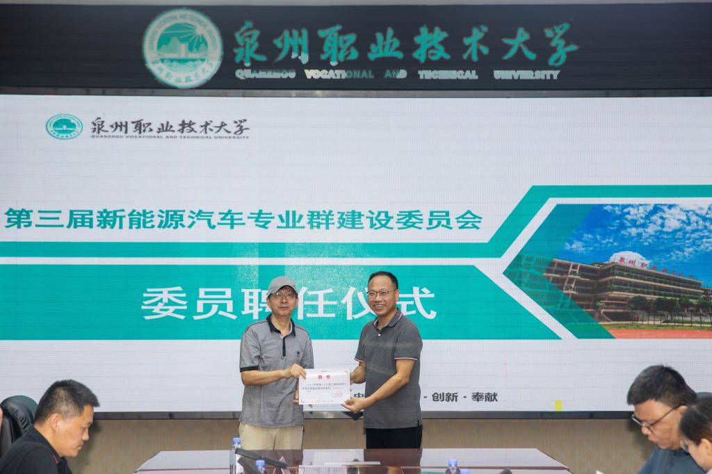 随后进行本次会议的第一项议程,为新聘任的新能源汽车专业群建设委员会主任、副主任以及委员颁发聘任书。