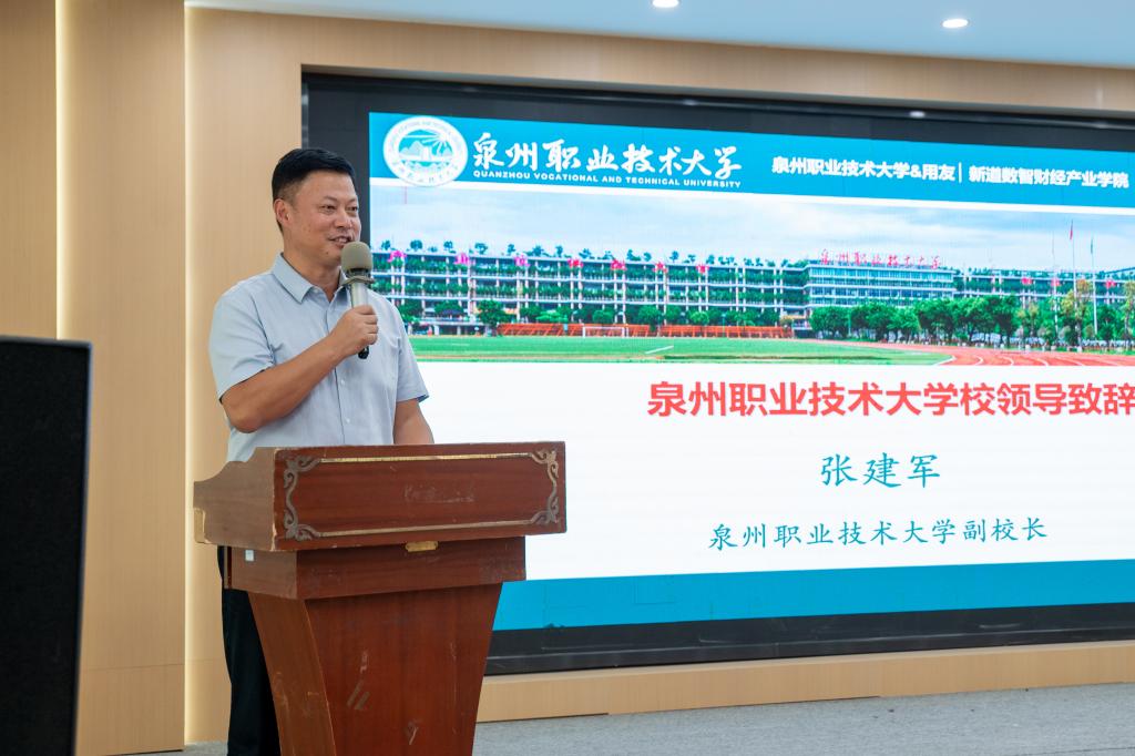 张建军代表学校致辞,指出新道数智财经产业学院的成立,是学校推进校企合作“三个一工程”的重要举措,是打造高水平数智商业服务专业群的一个重要支撑,也是深化职业本科教育改革、提高人才培养质量的一个重要抓手。希望产业学院在提升数智引领力、育人贡献力、内涵建设力、社会服务力上下功夫,着力打造校企合作品牌。希望各位同学珍惜机会,不断提高认知能力、学习能力、数智能力、创新能力和职业素养,努力成长为适应行业数字化、智能化发展需求的高层次技术技能人才。
