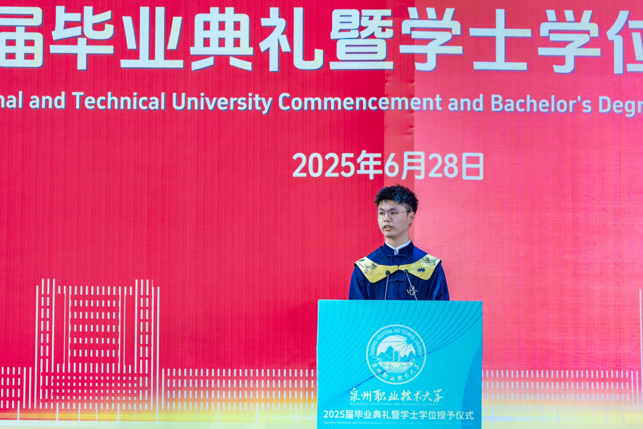 毕业生代表陈嘉鹏分享逆袭成长之路,2018年,经历中考失利后,他选择职业教育赛道。2021年,在全省职业本科升学录取率仅2%的激烈竞争中脱颖而出考入泉大。