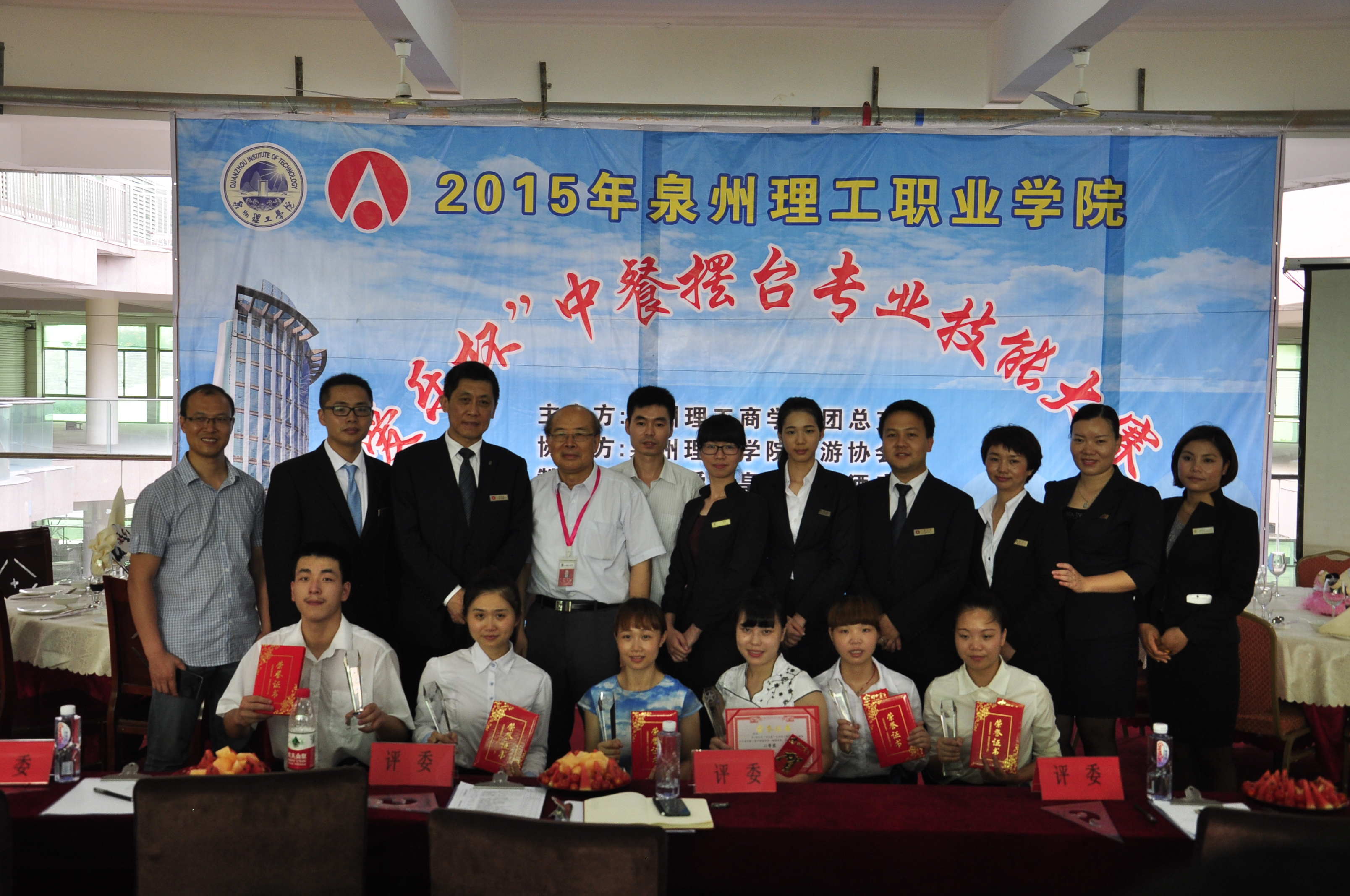 决赛开始前,还进行了泉州理工学院与石狮爱乐皇冠假日酒店校企合作授牌仪式。本次技能大赛经过一个多月的初赛、复赛、最终产生六名选手进入决赛。决赛由个人仪容仪表展示、中餐摆台设计、英语口语测试三个部分组成。在经过精彩的比拼,6名参赛选手经过激烈的争夺之后,获得2015年泉州理工学院中餐摆台大赛一等奖的是四号选手邓婕;获得二等奖的是五号选手何思敏,三号选手李燕;获得三等奖的是一号选手缪双惠、二号选手吴小芳、六号选手陈宇阳。